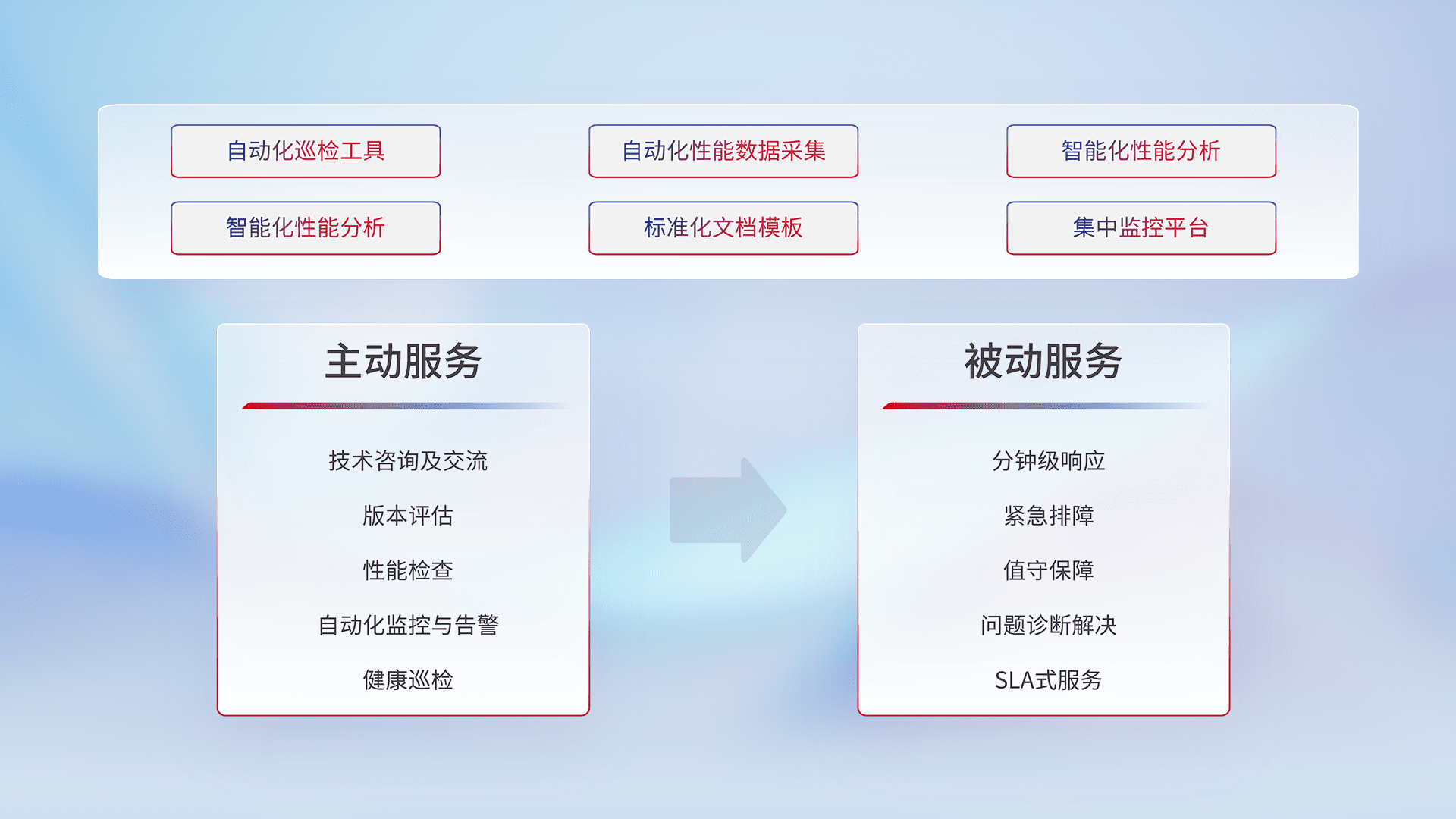 智能化工具和标准化文档,,,,保障服务质量,,提供主动服务(包含技术咨询、、、版本评估、、、、性能检查、、、自动化监控与告警、、、、健康巡检)和被动服务包含(分钟级响应、、紧急排障、、、值守保障、、问题诊断解决、、、SLA服务)。。